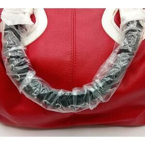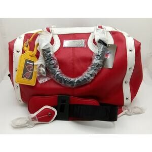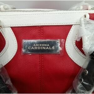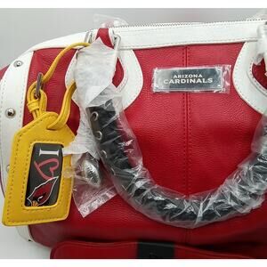 NWT. The Arizona Cardinals NFL Suite Team Duffle Bag by Little Earth is a stylish and practical accessory for any female fan of the team. Made of 80% vinyl and 20% polyester, this red bag features a metal plate with the team's name and is officially licensed by the NFL. With a size of 14 x 10 inches, it includes a bag tag, football bag chain, and adjustable bag buckles. The bag also has bottom feet to keep it clean, 2 handles, an extra strap, zipper closure, and 2 slat pockets inside for organization. Perfect for transporting your team spirit on game day.