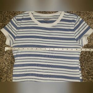 This Arizona Jean Company tee showcases a classic blue and white striped pattern, perfect for a casual day out. The short sleeves and round neckline add to its relaxed style, while the soft fabric ensures comfort throughout the day.