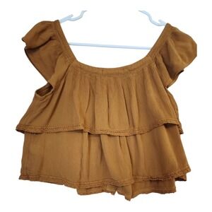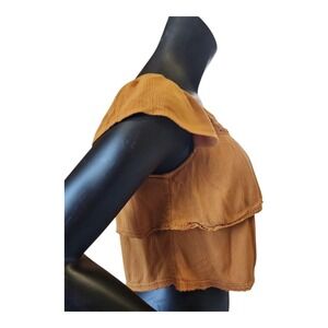 This Arizona Jean Co tiered cropped blouse in women's size M features a deep bronze color, soft fabric, and flattering short sleeves. Perfect for casual wear or pairing with high-waisted jeans and skirts for a relaxed, boho look.