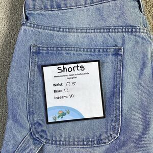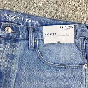 Keywords: Arizona Jean Co., denim shorts, baggy fit, carpenter shorts, blue shorts, men's shorts, casual shorts, size 34, light wash, jeans shorts