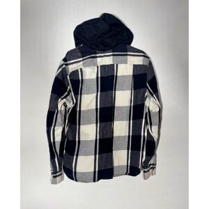 Arizona Jean Co Flannel Shirt Jacket Black White Plaid Hooded Button‑Up M