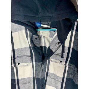 • Style: Hooded flannel / shirt jacket (shacket), button‑up front with hood