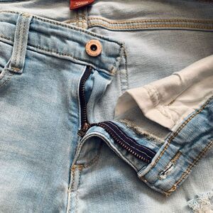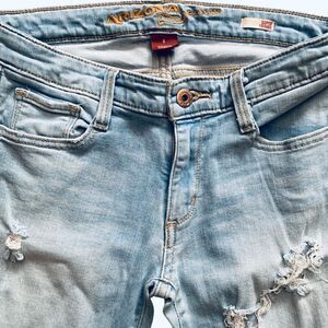 Light wash ripped distressed skinny jeans. Mid-rise. 5 pocket. Button/zip fly. Cotton/spandex fabric. In good preowned condition. Arizona Jean Co Size 5
