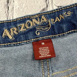 Preloved Arizona Jean Co. plus size denim capri pants in women's size 19. These classic denim capris feature a unique fringe design on the bottom of the pants leg, adding a touch of trendy style to a casual staple. The comfortable, relaxed fit is perfect for everyday wear.