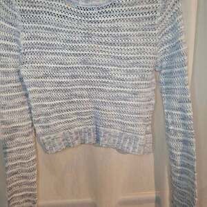 Arizona Jean Co Women's Crew Neck Knit Cropped Sweater, Size S in blue and white. This sweater features a stylish open knit design, perfect for layering. In excellent used condition, with no stains or holes.