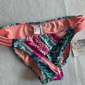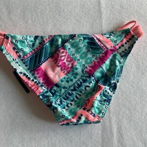 Add vibrant style to your swimwear collection with these Arizona Jean Co. women’s hipster bikini bottoms in size Small. Featuring a colorful pink, teal, and blue geometric print with side strap detail, these bottoms offer a trendy, flattering fit that's perfect for beach days and poolside lounging.