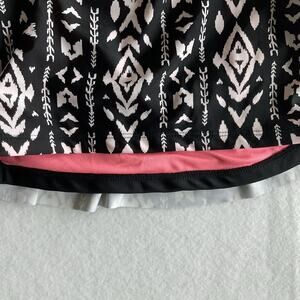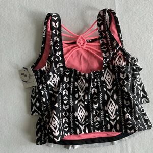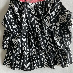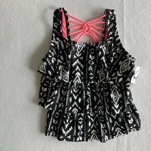 Make a splash with this flattering and stylish Arizona Jean Co. women's layered swim tankini top in plus size M (10 1/2 - 12 1/2 PLUS) Featuring a bold black and white tribal geometric print, this swim top offers a tiered ruffle front for a slimming effect and a fun coral pink strappy back detail for added flair.