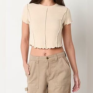 This stylish crop top from Arizona Jean Company features a vibrant purple hue and a flattering flutter sleeve design. The ribbed texture and ruffled edges add a touch of elegance, making it a perfect choice for casual outings. Its lightweight and stretchy fabric ensures comfort throughout the day.