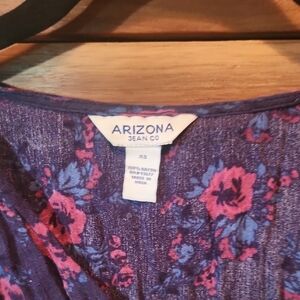 This Arizona Jean Company blouse showcases a chic wrap design with short flutter sleeves, offering a stylish peplum silhouette. The top is beautifully crafted in a blend of blue and purple hues, perfect for adding a touch of elegance to any outfit. Its light and flowy fabric ensures comfort and sophistication for any occasion.