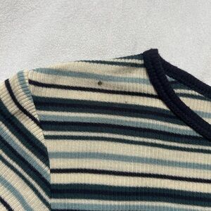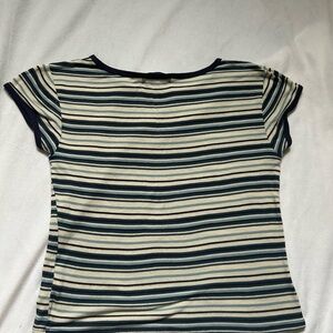 Casual tee with navy and cream stripes. Perfect for everyday wear. Soft and comfortable fabric. There’s a small barely noticeable stain on the shirt
