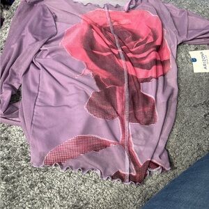 Stylish mesh top with a bold rose design. Features a mix of purple and pink hues. Perfect for casual outings.