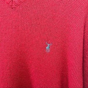 Classic V-neck sweater. Rich red color. Embroidered logo detail.