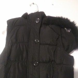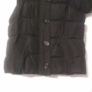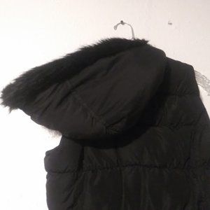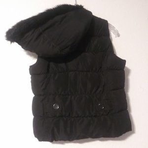 Arizona Jean Company women's size M black puffer vest, button and zipper closure, furry hood trim