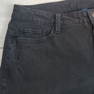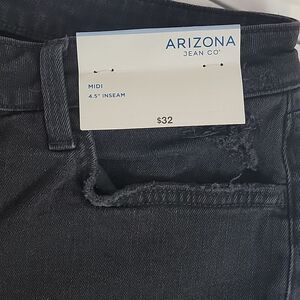 Stylish and comfortable black midi shorts by Arizona Jean Company with a high rise, 4.5" Inseam, and manufacture distressing including frayed pockets and rips and tears.