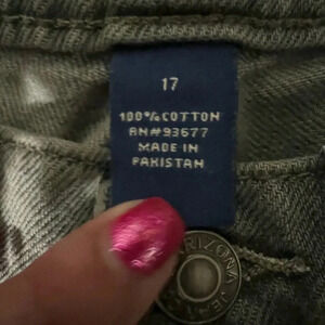 The jeans are available in size 17 and have a waist size of 27 inches, with a tapered leg and mid-rise. They are machine washable and easy to care for, making them a convenient addition to your wardrobe. The jeans are distressed and have accents like buttons and logos that add a touch of sophistication. Perfect for any season, these jeans are a must-have for any fashion-conscious woman.