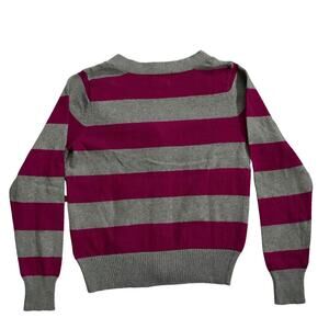 NWT. Cardigan for Girls Size M (7/8). Long Sleeves, Stripes - Grey and Purple (as per tag color is known as "Aragon Purple"), sparkly buttons for closure, ribbed cuffs and bottom hem, 3D Flower Design top left, knit construction, comes with extra button. Pictures are part of description.