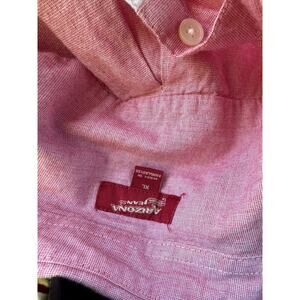 90s or Y2K vintage Arizona Jeans Company men's shirt. Pink denim like material with a white stripe. All cotton construction. No flaws to note. I think this may be a teens sizing, so please read the measurements, because this seems more like a men's large. Cleaned and stored in a smoke-free home.