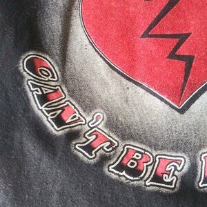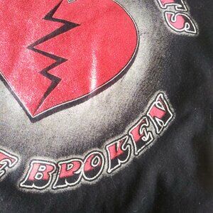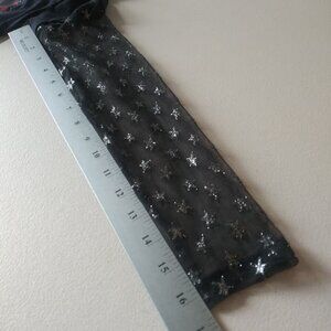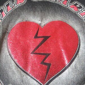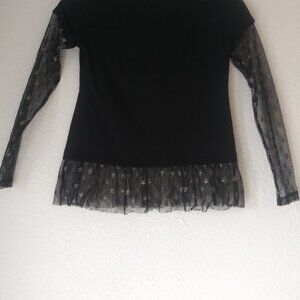 Arizona Jeans Company black and red long sleeve shirt, heart logo in the center, mesh at sleeves and bottom hem with metallic stars