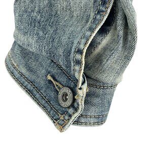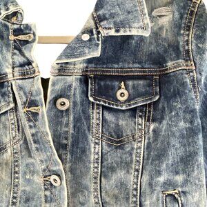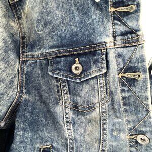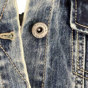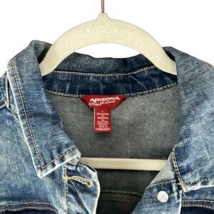 This denim jacket by Arizona Jeans melds classic rugged style with a touch of whimsy through its vibrant floral crochet patches. The jacket's distressed finish and stylish buttoned front add a laid-back charm. Ideal for layering in transitional weather, it provides both warmth and a playful, artistic flair to any ensemble.