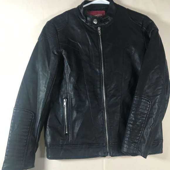 Elevate your wardrobe with this stylish black faux leather riding jacket from AriZona. Designed with a full zip closure and zip-up pockets, this mid-length biker jacket is perfect for travel or casual occasions. The long sleeves add a touch of sophistication, while the solid pattern and accents make it a versatile addition to any outfit. Crafted from high-quality polyester with a comfortable lining, it's suitable for wear in summer, fall, and spring. This regular fit jacket comes in size L and doesn't compromise on style or functionality. Don't miss out on this must-have piece that's perfect for any fashion-forward woman.