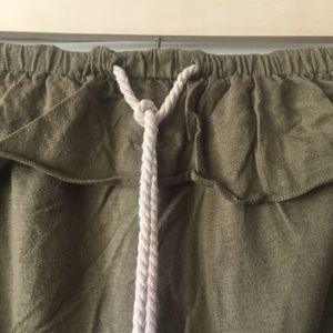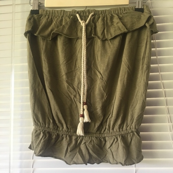 Arizona Jeans co. green olive strapless top with elastic band at the top and bottom with ruffle effects. Funny tassels with wooden beads. It looks great with jeans, mini shorts or maxi skirts - super versatile.