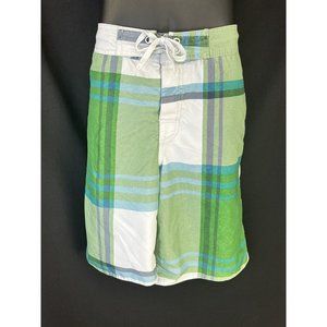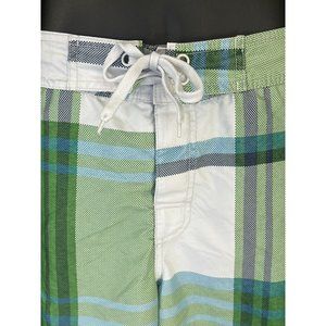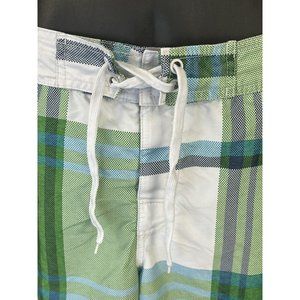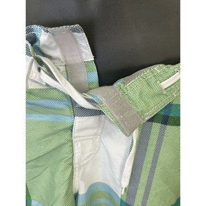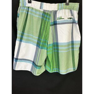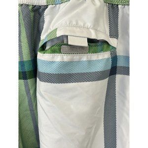 Shades of green plaid. In excellent condition. Closing pocket in back with Velcro. Velcro on fly too. Elastic waist and adjustable tie in front. 18” waist, 9” inseam, 21” total length. Measurements taken while garment is laying flat and on front side only. Mesh liner in great condition.