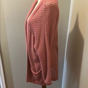 Stay cozy and stylish with this pink open-knit sweater. Perfect for layering, it adds a touch of elegance to any outfit.