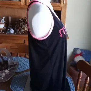 Black/pink graphic racerback tank top. Front says: "SUNTURNT". High/low curved hemline. Super soft burnout fabric. 65% polyester, 35% rayon. New without tags.