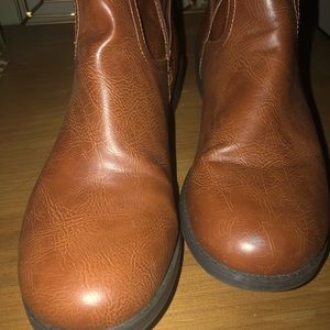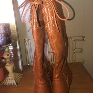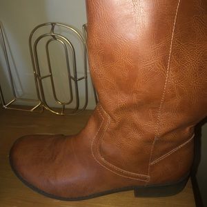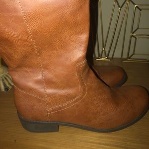 Arizona knee riding boots . This shoe has memory foam sole like new but does have black scuff mark on one heal & a small white speck on inner shoe both you can see in pics color is cognac