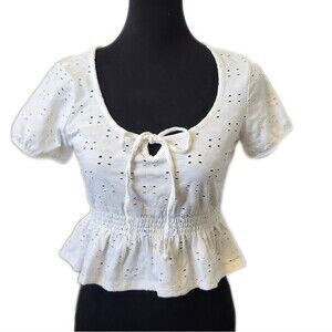 Arizona Scoop Neck White Eyelet Cropped Peplum Blouse, Puff Sleeves, S