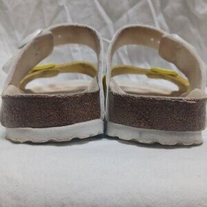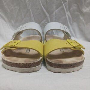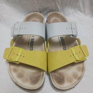 The BIRKENSTOCK Arizona Split Birko-Flor Green/White and Yellow/White sandals are genuine classic that has been delighting both men and women with its timeless design for decades. This version of the sandal plays with contrasts and color-blocking and features brand-new colors. The color-coordinated footbed and the buckles round off the shoe's look of sophistication. The upper is made from the skin-friendly, hard-wearing synthetic material Birko-Flor®.