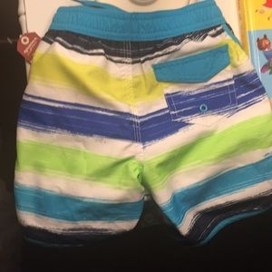 Stripes of blues, green and yellow, swim shorts for toddler boy