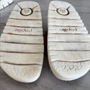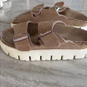 Chic pink suede sandals with pink buckles. Perfect for casual outings. Papillio by Birkenstock. Size 37. Well loved and priced appropriately