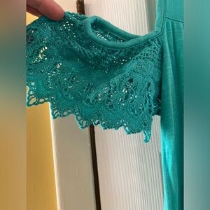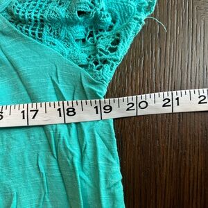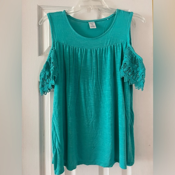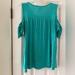 Arizona cold shoulder tee; Kids plus size 18.5; P2P 19”; Color blue/green/turquoise; Material Rayon, spandex, cotton; Washed and worn with no known damage; 6.4 oz