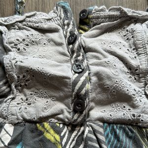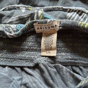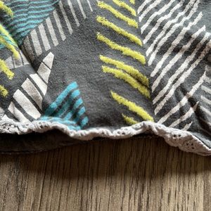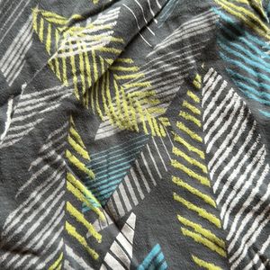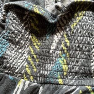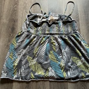 Dark grey tank with scrunched back with lace detailing on the bottom and chest. Green, blue, white leaf design. Size l