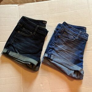 Arizona-7-two pair shorts-dark denim&Medium denim, mid rise, cuffed short jean shorts. Dark pair-slight distress 99% cotton, 1% spandex. Medium pair-73% cotton, 25% polyester, 2% spandex. Both pairs-three packets in the front two pockets in the back. Zipper and button to close in front. belt loops. See photos for approximate flat measurements.