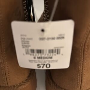This is new with tags. Medium width. Textile uppers, the lining is polyester fleece sherpa lined. These are flat with 2 inch platform. The color is cognac brown. The height from top to bottom is 7 inches. The circumference is 12 inches.