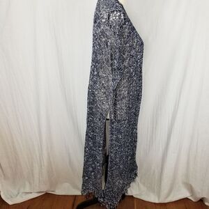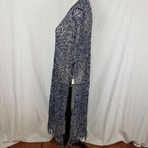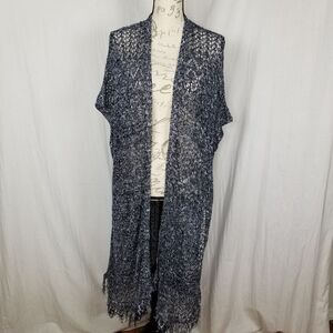 Beautiful blue marble open weave open front full length cardigan! Pair it with tall black boots, black leggings and a long sleeve white top or pair it with a pair of cute casual shoes, blue jeans and a white top for a more casual look!
