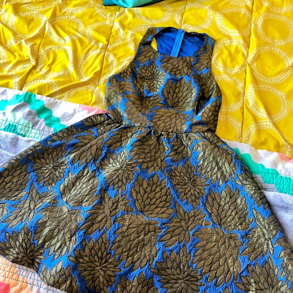 A gorgeous Ark & Co. dress purchased from a local boutique. The fabric is unbelievable in person, slightly shiny, beautiful structure, and with a really unique pattern in a bronze-y gold that personally reminded me of artichokes (or maybe hops if you are, or know, a craft beer aficianado). The cut-outs in the back are a fun surprise. It was worn once on my birthday and it's in perfect condition. Measurements in pictures, but please let me know if you have any questions.