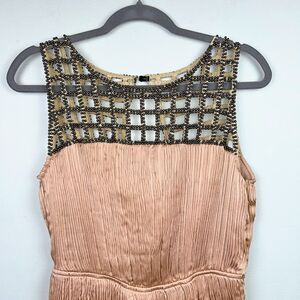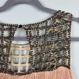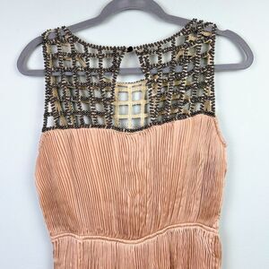 Ark & Co Anthropologie peach pink pleated cocktail dress with beautiful cage cut out beading detail along the top. This flapper boho style dress is perfect for weddings or other formal occasions. Lined, Zip and button closure. Women's size M medium, measurements pictured. Excellent used condition.