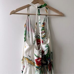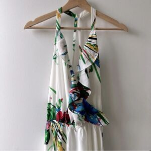 NWT Ark & Co floral on white maxi dress, size medium, featuring a vibrant floral print and a ruffled neckline. This sleeveless maxi dress has an elastic waist and a stylish cut-out back, perfect for a chic, breezy look. It includes a tear shown in photo, offering the option to hem at midi length or create a trendy Hi-Lo design.