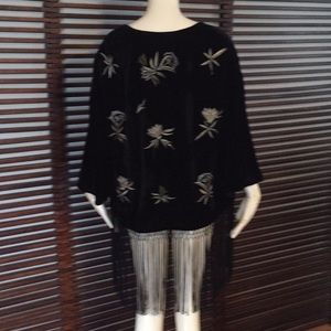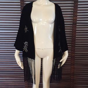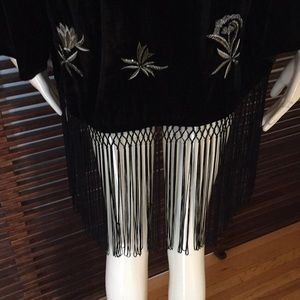 Gorgeous velvet open front jacket with hook and eye closure. . Embroidery detail and fringed hem. Great condition but there is a little spot on front that is slightly frayed. Shown in pic. 💥Offers welcome💥