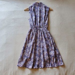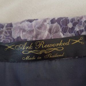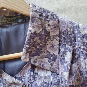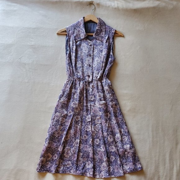 Ark Reworked sleeveless fitted button-down dress. Never worn, in perfect condition. Constructed with vintage materials. Size is not indicated, best suited for XS or 0. Beautiful vintage floral fabric and stunning purple buttons on bodice. Skirt is pleated with discreet front zipper closure. Colors are lavender, mauve, silver. Lavender lining.