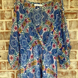 Ark n c. Blue Geometric Floral Sheer Cold Shoulder Maxi Dress