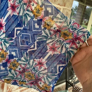 Geometric design and floral design in colors of blue, white, yellow, pink, green