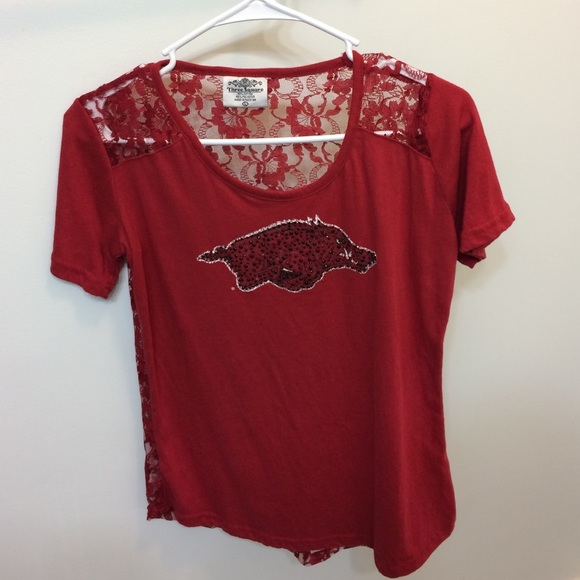 Red Arkansas Razorback shirt! Razorback has sparkly gems on it! A little bit of wear in the armpits. (See picture) very cute!