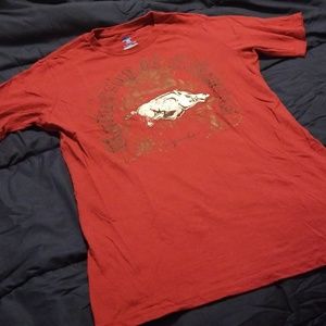 Great conditon tee. Minor wear no holes or stains. University of Arkansas with Razotback on front. Dark red tee. Approx 18.5" across and 26" long.