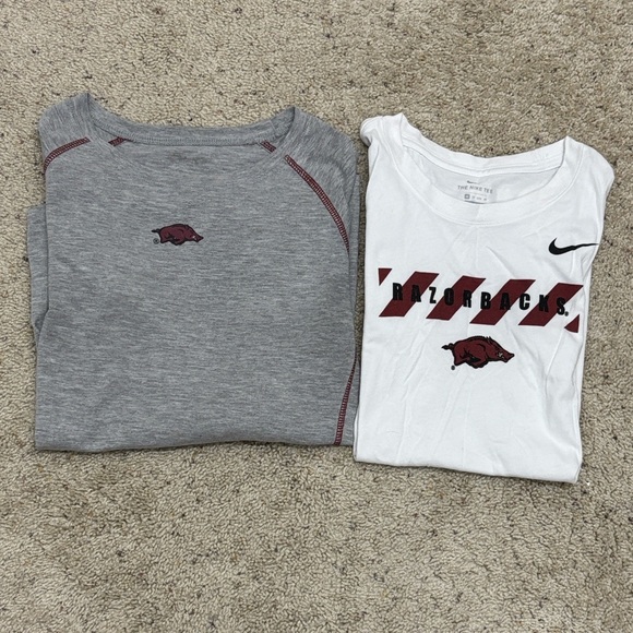 Arkansas Razorback tee bundle, long sleeve gray tee, size S, and white Nike tee, size XS, no flaws