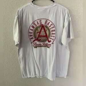 Classic white tee with Arkansas Baseball graphic. Soft and comfortable. Ideal for casual wear.