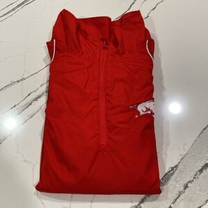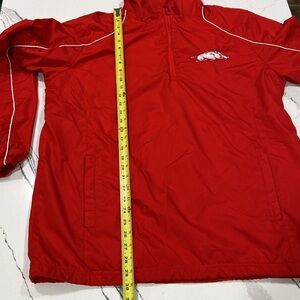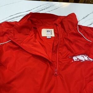 Arkansas Razorbacks Jacket Box Seat. Really nice quarter zip jacket with elastic wrists, drawstring waist and two zippered pockets. See pictures for measurements and condition. Thanks for looking. Offers welcomed.